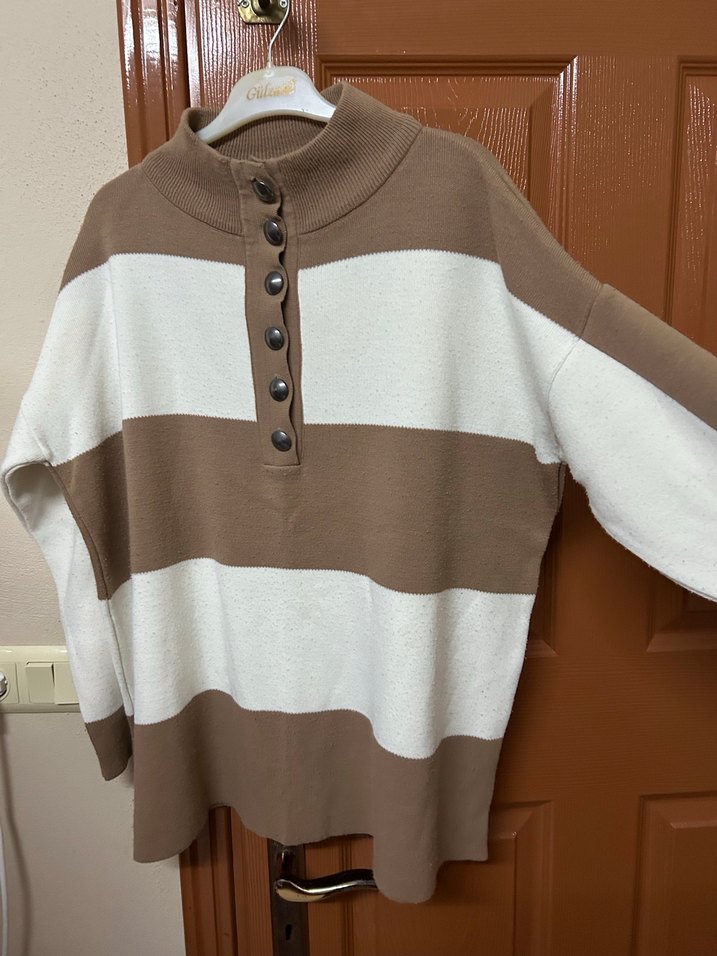 Düğmeli Kahverengi Beyaz Çizgili Kadın Kazak