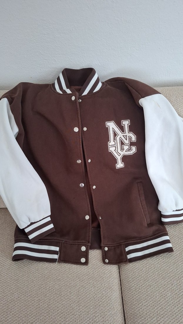 Kahverengi deri ceket, uzun beyaz kollu, düğmeli ve baskılı NYC harfli, rahat kesim, günlük kullanıma uygun. kolunda küçük bir iki leke var çıkarma bilmiyorum denemedim fiyatı uygun tutuyorum.