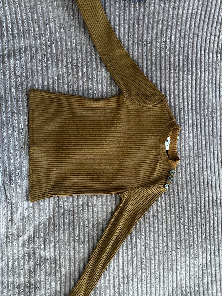 Düğmeli, boğazlı ve uzun kollu kahverengi kadın kazak. Yumuşak sentetik kumaştan, rahat ve günlük kullanıma uygun stil sunar.
