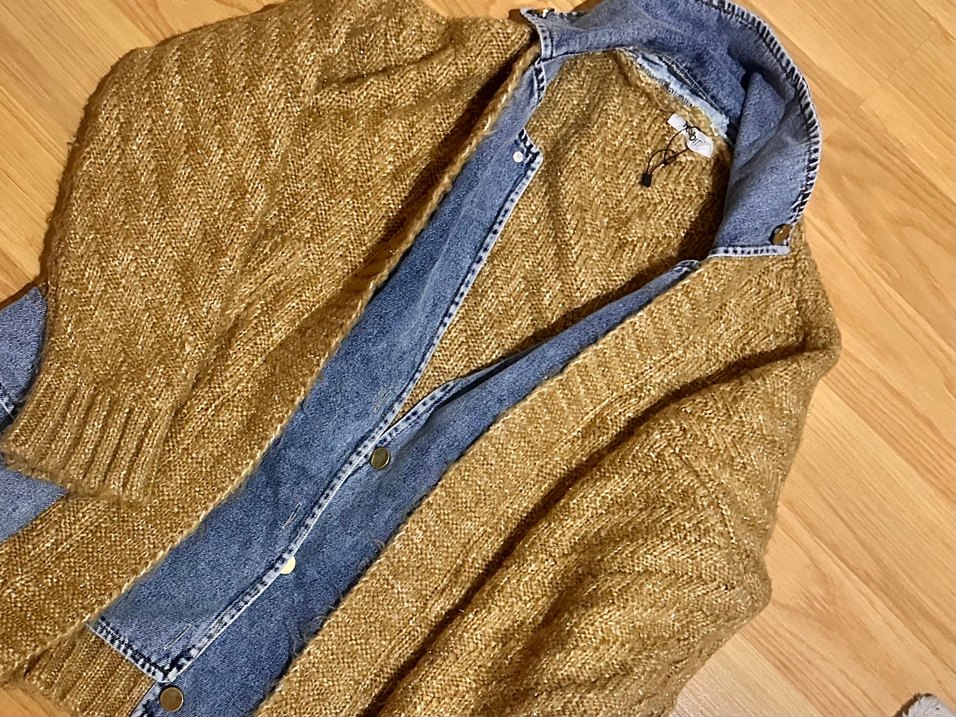 Düğmeli kahverengi denim ceket, bohem tarzda, geniş kesim ve normal boyda. Uzun kollu ve parlak dokulu, rahat bir görünüm sağlar.