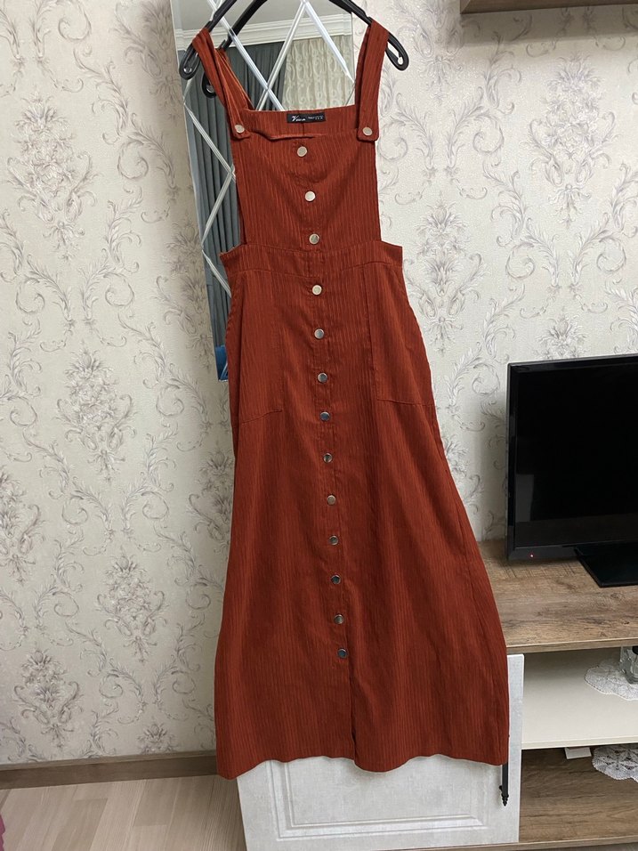 Düğmeli ön kısmı ve askısız yaka detayıyla kahverengi, uzun ve bol kesim tulum. Sentetik kumaştan yapılmış, bohem tarzında ve günlük kullanıma uygun. 38 bedene de olur