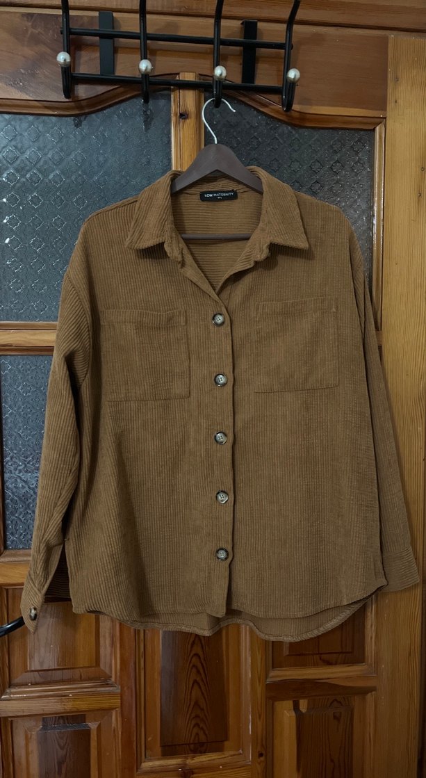 Kahverengi, bol kesim kadın gömlek, uzun kollu ve çentikli yaka ile. Keten kumaştan, düğmeli ön ve normal midi boyda, rahat sokak stili için uygun. Boyu 70cm iki kol arası 57 cm