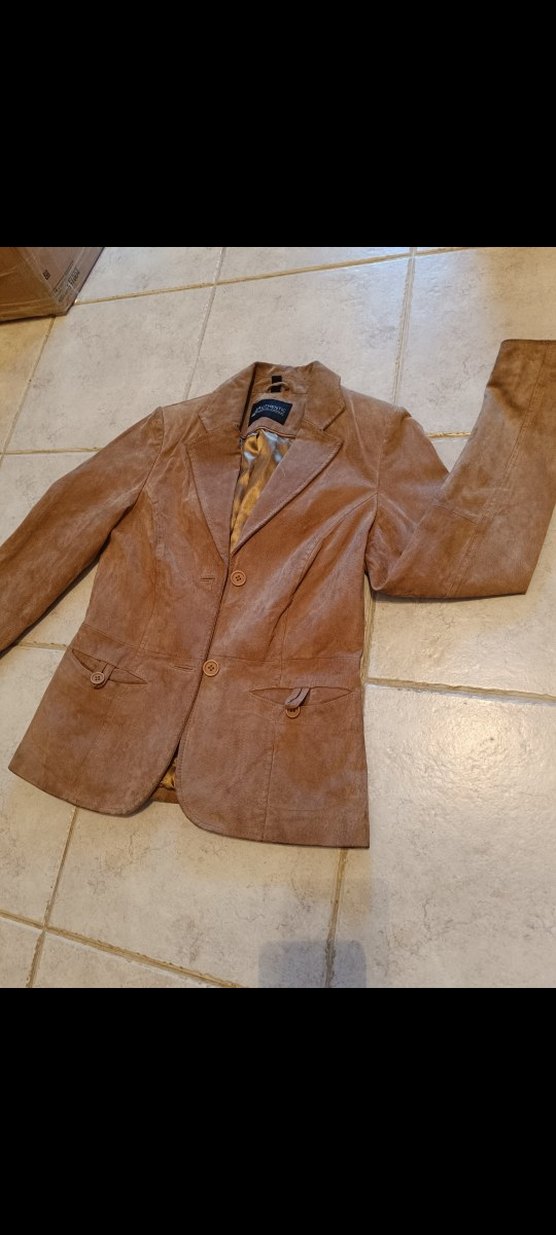 camel rengi süet kadın ceket, kesik yakalı ve uzun kolludur. Düğmeli ön kısmı, normal kesimi ve midi boyu ile ofis ve günlük şıklık için uygundur. hakiki deri mağazasından aldım ürün orijinaldir hiç giyilmedi 36 38 bedene uygundur