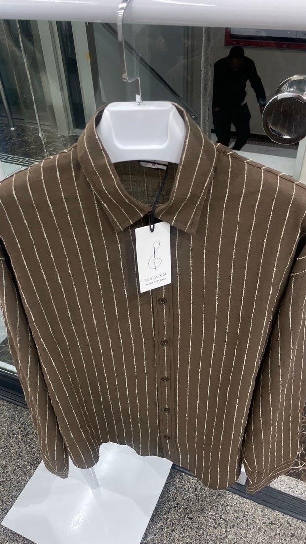 Kahverengi keten gömlek, uzun kollu ve düğmeli, yakalı tasarıma sahiptir. Çizgili deseni ve regular fit kesimiyle günlük rahat sokak stiline uygundur.
