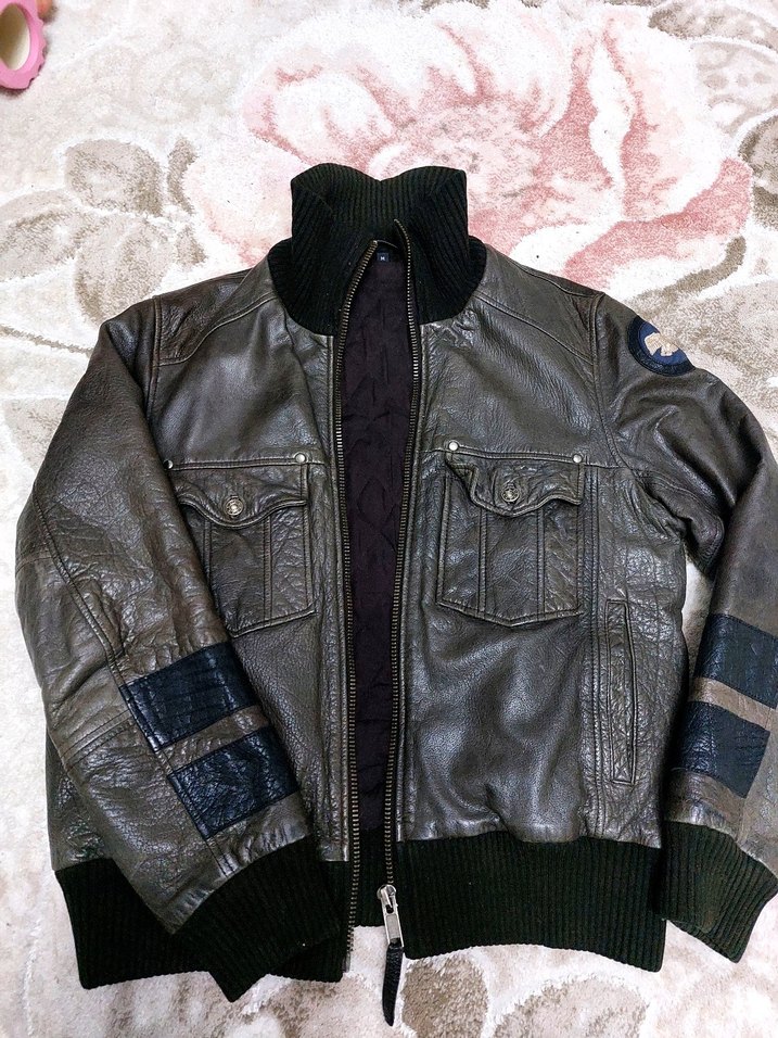Düğmeli cepli, yakalı, uzun kollu ve normal uzunlukta, koyu kahverengi deri biker ceket.