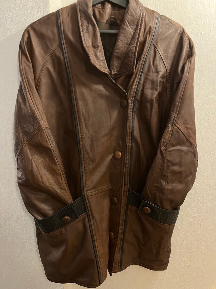 Düğmeli kahverengi deri biker ceket, kesik yakalı ve uzun kolludur. Midi boy, rahat kesim ve cep düğmeleri ile günlük kullanıma uygundur.