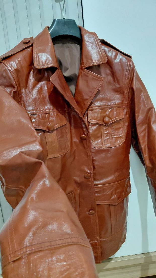 Düğmeli, kahverengi deri biker ceket, parlak görünümlü, uzun kollu ve normal kesim midi boyda. Günlük kullanıma uygundur.hakiki deridir.ozel dikimdir s bedene de olabilir istenirse ölçü verebilirim