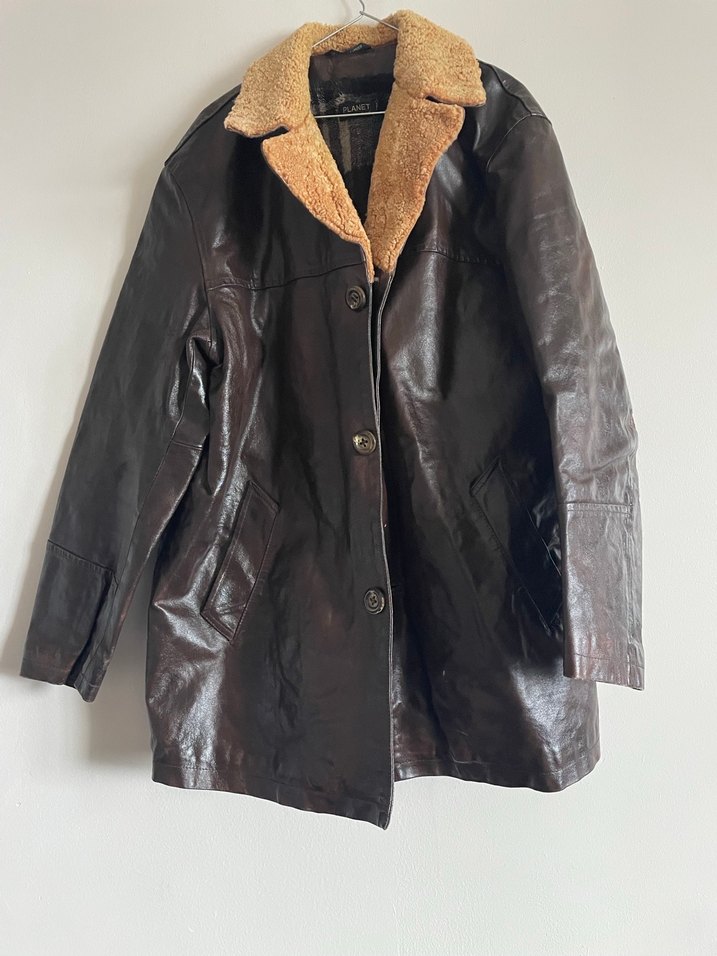 Kahverengi deri ceket, düğmeli ve kesik yaka detaylıdır. Uzun kollu, normal kesim ve günlük sokak stili için uygundur. Sıcak, tüylü yaka konfor sağlar.