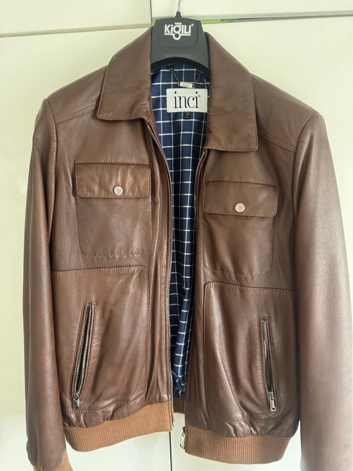 Kahverengi deri erkek ceketi, düğmeli ve kesik yaka detaylıdır. Uzun kollu, normal kesim ve parlak biker tarzındadır. Günlük kullanıma uygundur. Marka etiketi 'inci'dir.