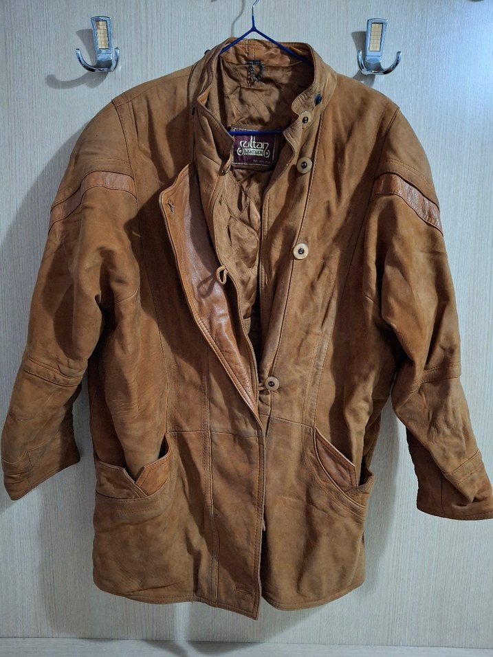 Kahverengi süet, düğmeli, klasik yakalı erkek ceket. Normal boyda, uzun kollu ve parlak görünümlü, günlük sokak stili için uygun.Boy 82 cm ,omuz 42 cm , kol boyu 59 cm,kol altı 60 cm