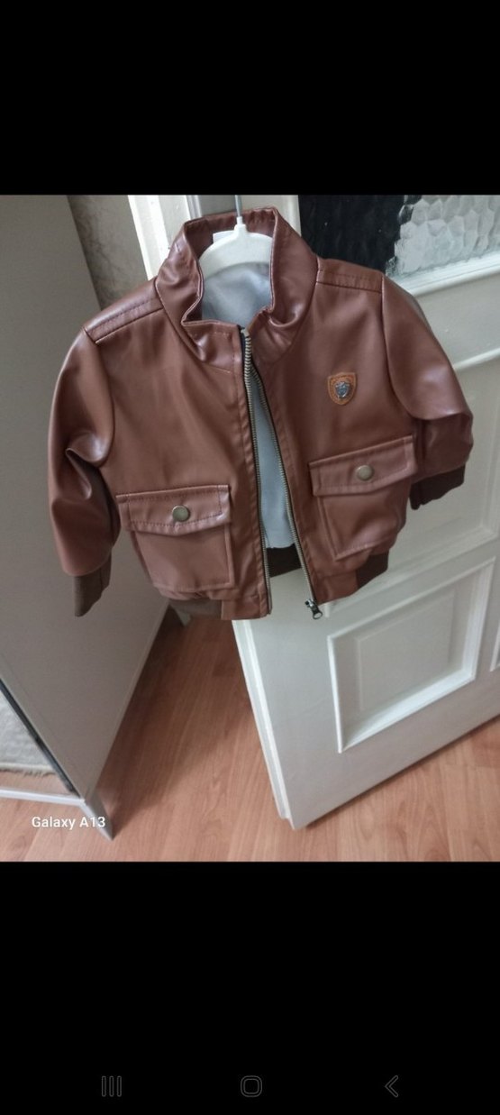 Düğmeli ön kısmı ve kesik yaka detayıyla kahverengi deri erkek çocuk ceketi, rahat kesim ve sokak stili sunar. Desensiz ve trend görünümlü.