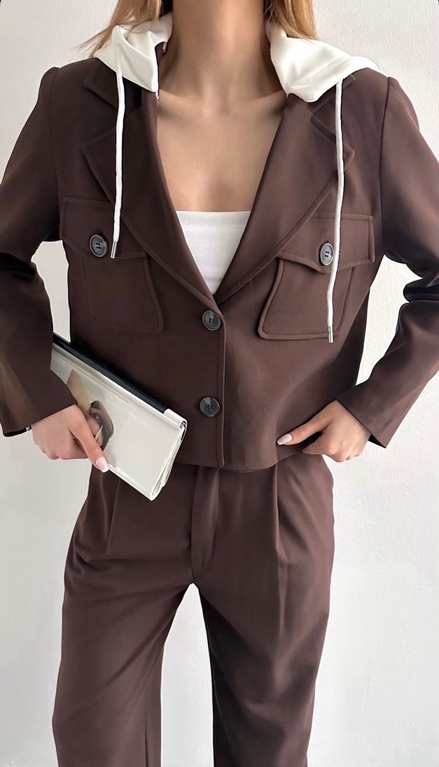 Kahverengi deri kumaştan, düğmeli, uzun kollu ve kesimli yaka detaylı kadın blazer. Ofis ve gündelik rahat tarz için uygun midi boyda, regular fit.