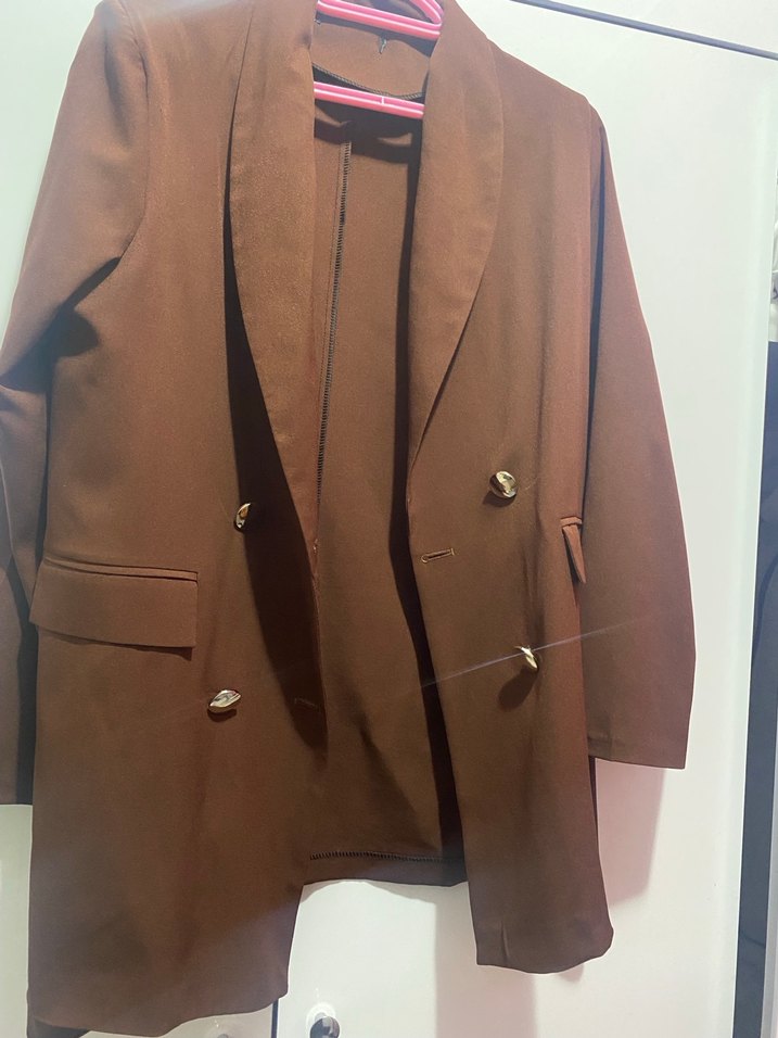 Düğmeli kahverengi deri blazer, kesik yakalı ve normal midi boydadır. Regular fit ve askılı kollu, ofis için uygundur.