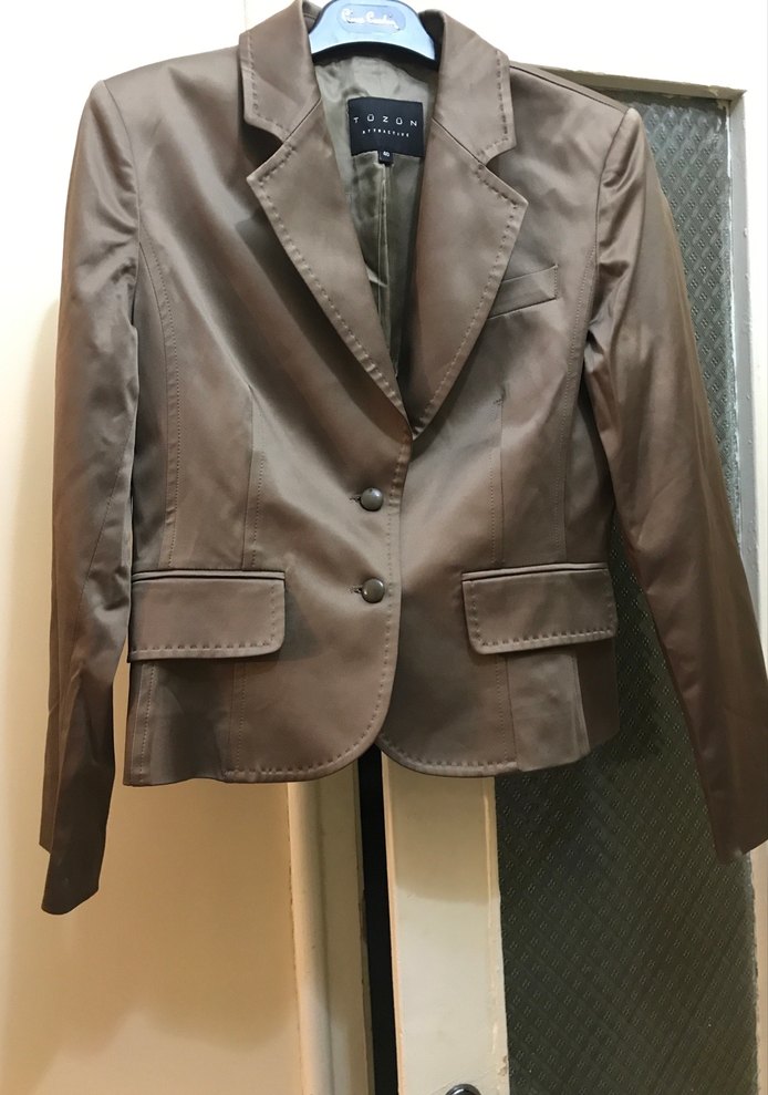 Kahverengi deri, düğmeli, uzun kollu kadın blazer ceket. Normal boy ve regular fit, ofis ve günlük kullanıma uygun.