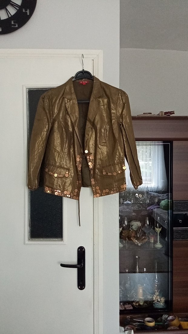 Düğmeli, kahverengi deri ceket, keskin yaka ve uzun kollu. Parlak yüzeyli, ofis ve sokak stiline uygun. ✨