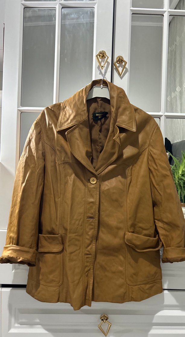 Düğmeli, kahverengi deri kadın ceket parlak yüzeye sahip. Notlu yaka, uzun kollu ve normal uzunlukta, ofis kullanımı için uygun. Kolunda ufak noktakadar bir Defoe var