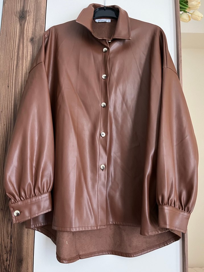 Bu kahverengi deri kadın ceket, parlak yüzey ve düğmeli kapanışa sahiptir. Salaş kesim, uzun kollu ve yakalı tasarım sunar.