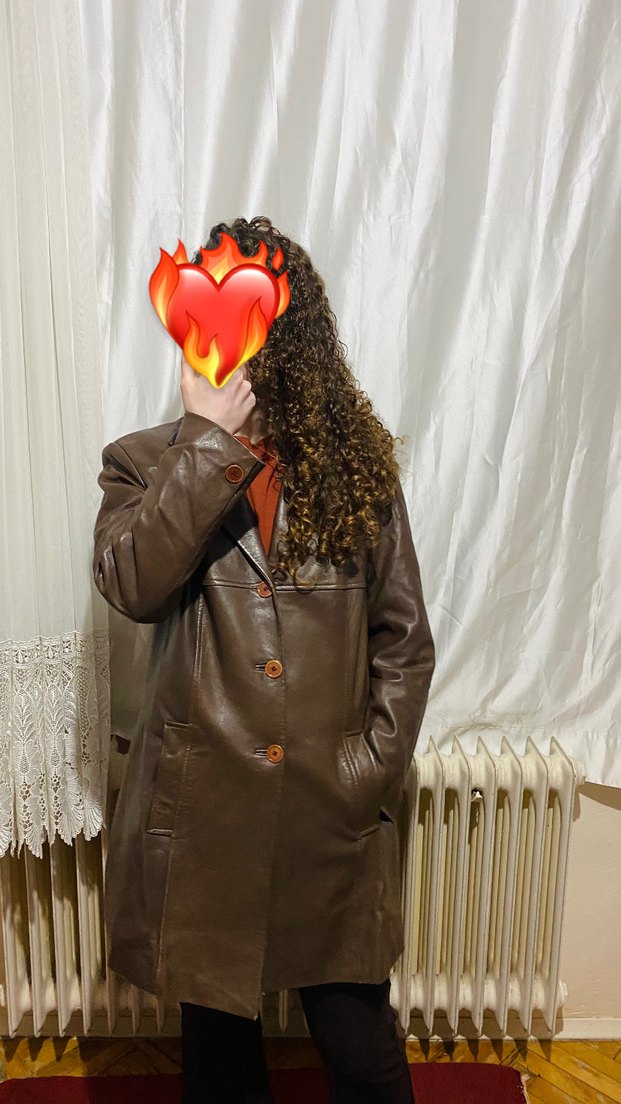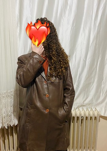 Düğmeli ve kahverengi deri ceket, notche d lapel yakalı, uzun kollu ve bol kesimdir. Koyu tonlarda , bohem ve sokak stili için uygundur.
