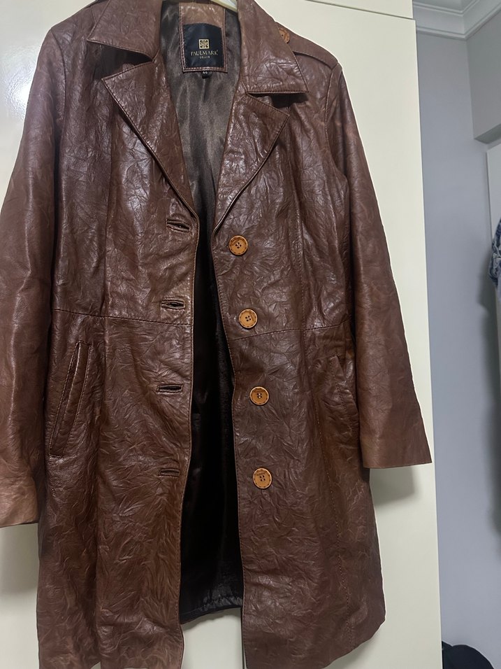 Kahverengi deri, düğmeli, uzun kollu kadın ceket. Normal kesim ve klasik sokak stiliyle midi boyda, günlük kullanıma uygun. Bazanın altındaydı biraz kırışmış