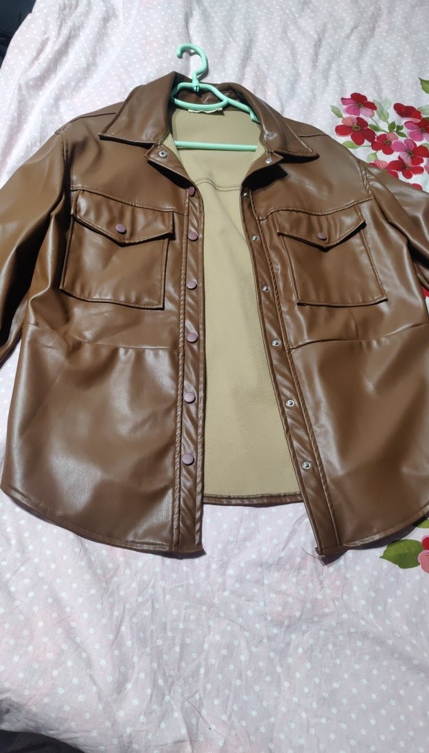 Kahverengi deri ceket, düğmeli ön ve uzun kolludur. Geniş kesim, çıtçıtlı yakası ve parlak yüzeyiyle günlük rahat sokak stiline uygundur.