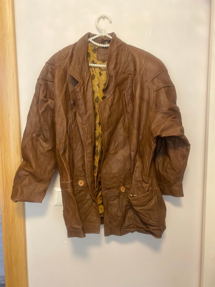 Kahverengi deri, düğmeli, uzun kollu, notched lapel yakalı, bol kesim midi uzunlukta kadın ceket. Günlük sokak stili için uygundur.