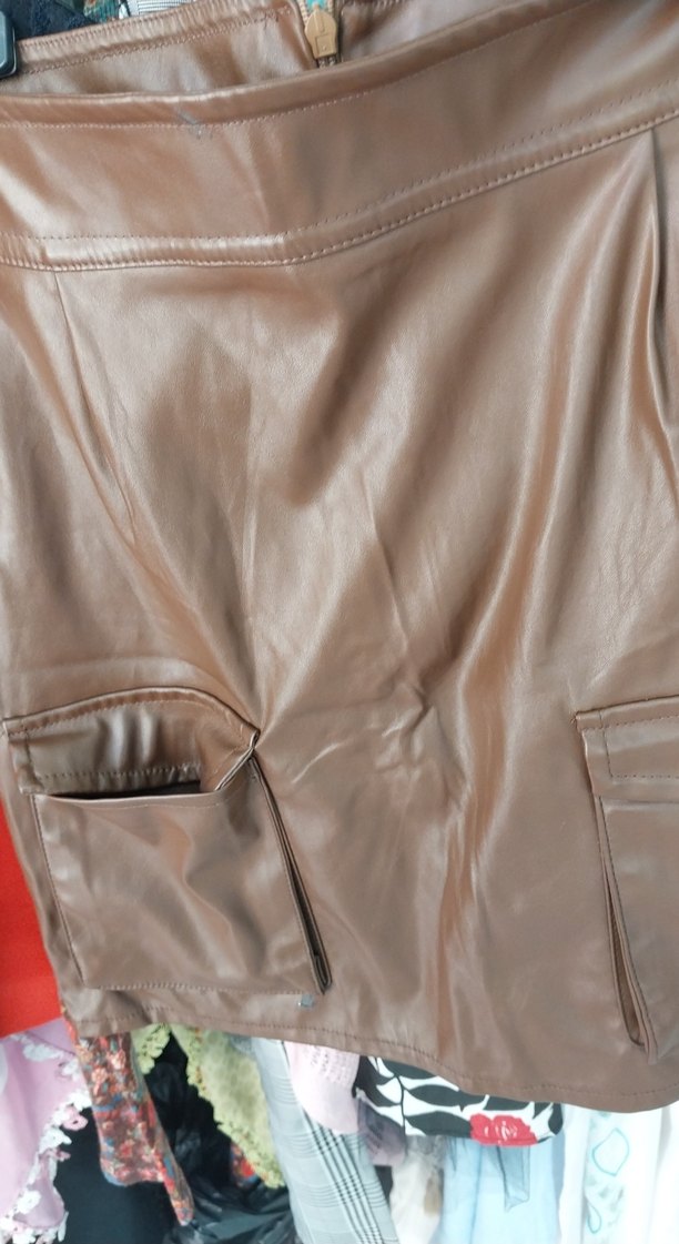 Düğmeli, parlak kahverengi deri kadın ceket. Notlu yaka, uzun kollu ve midi boyda, rahat ve şık bir sokak stili parçası.