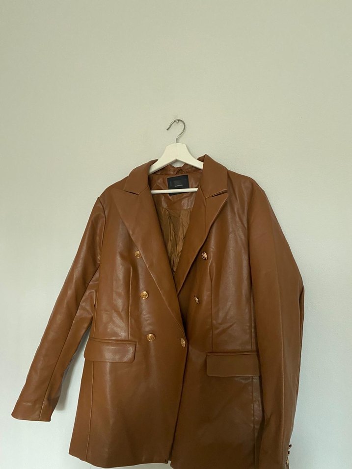 Düğmeli kahverengi deri kadın ceket, çıtçıt yakalı ve parlak görünümlüdür. Normal midi boy, regular fit ve çıtçıt kolludur. Ofis ve sokak stiline uygundur. Defosu mevcuttur