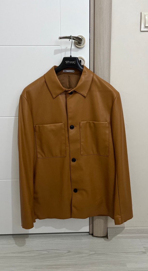 Kahverengi deri, düğmeli, uzun kollu, iki cepli, normal kesim kadın ceket. Notlu yaka ve minimal tasarım sunar.✨