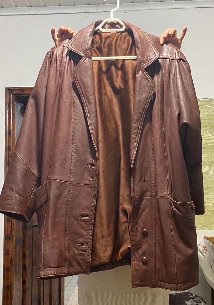 Vintage 80ler 90 lar ceketidir . Düğme kısmının beş tanesinde düşme olmuştur .Düğmeli, kahverengi deri ceket, keskin yakalı ve parlak, desen içermeyen yüzeye sahip. Uzun kollu, normal boyda ve rahat kesimdir. Günlük kullanım için uygundur.