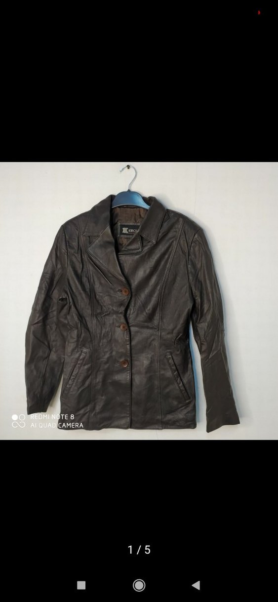 Kahverengi deri kadın ceketi, düğmeli, uzun kollu ve keskin yakalıdır. Normal boy ve rahat kesime sahiptir. Günlük rahat sokak stili için uygundur.