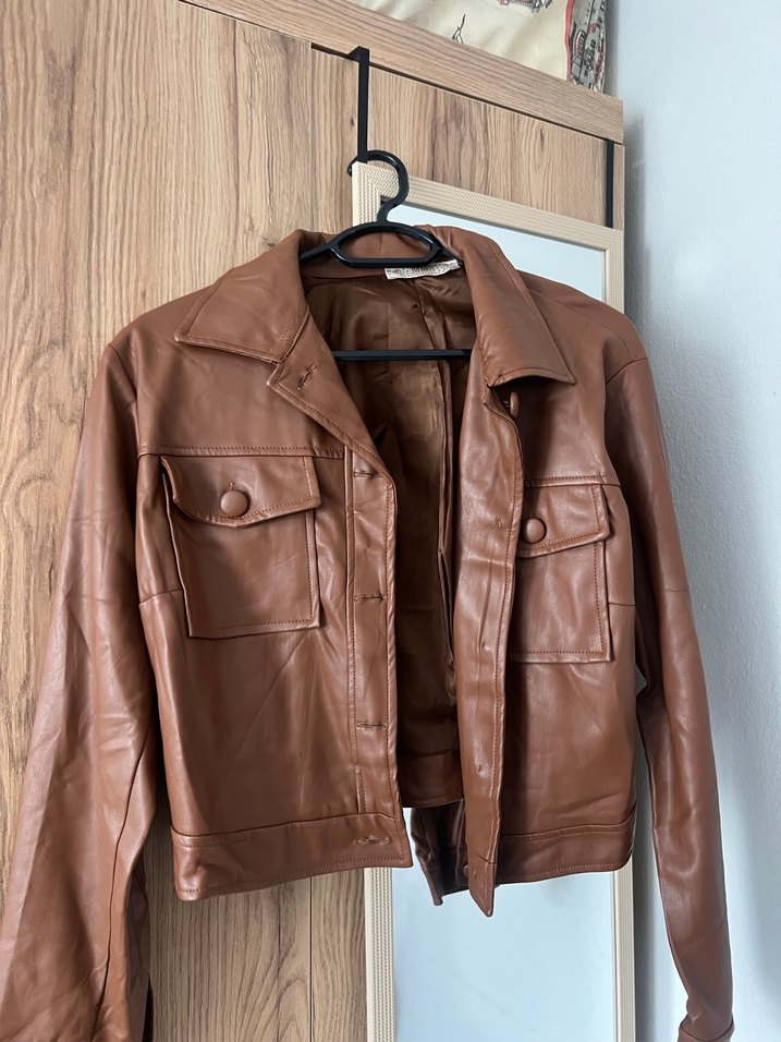 Kahverengi deri, düğmeli, kesik yaka ve normal kesim olan kadın ceket. Uzun kollu ve parlak görünümlü, günlük kullanım için uygundur.