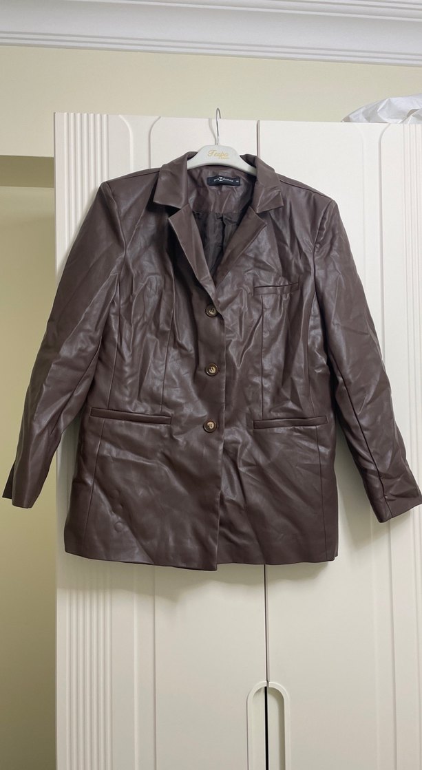 Kahverengi deri kadın ceket, düğmeli ve yaka detaylıdır. Uzun kollu, normal uzunlukta ve düzenli kalıptadır. Ofis ve günlük kullanıma uygundur.