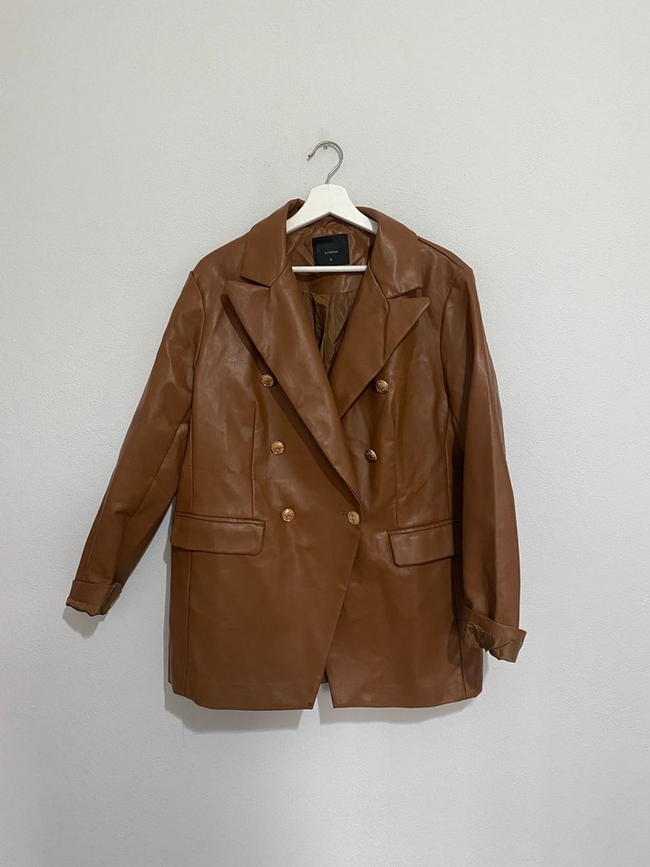 Kahverengi deri kadın ceket, parlak görünümlü, düğmeli ve kesik yaka detaylıdır. Midi boy, regular fit ve askılı kollu, ofis ve sokak modasına uygun, desen içermeyen şık bir parçadır. Defosu var