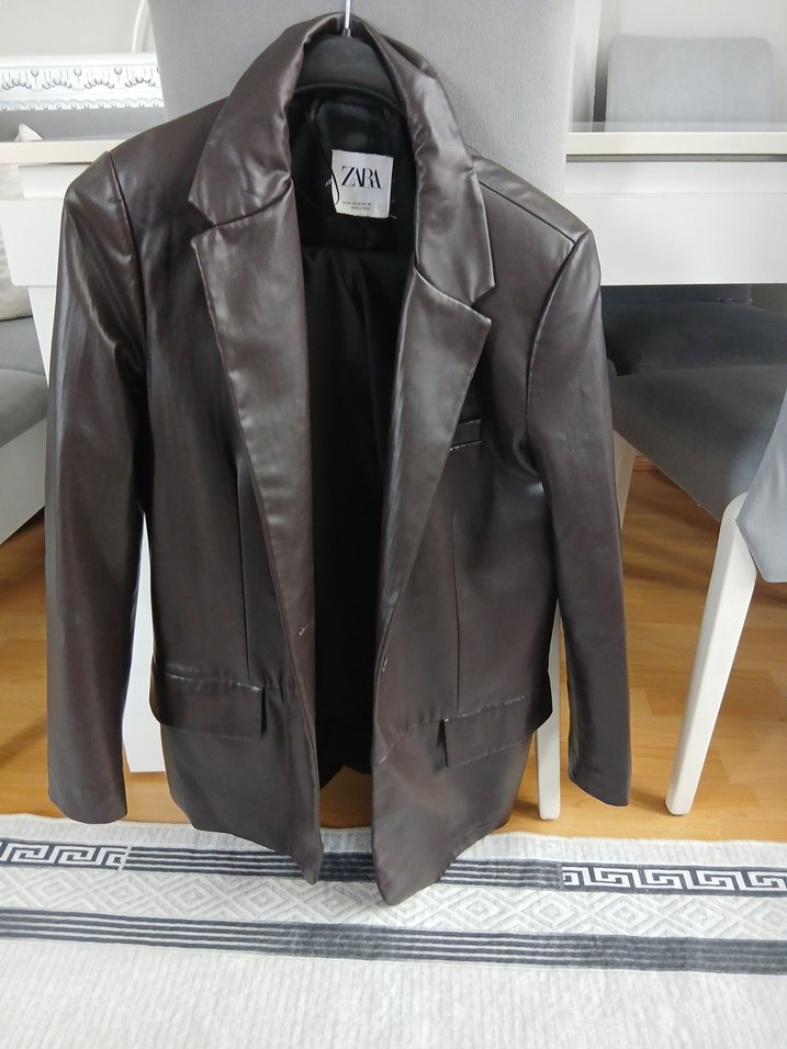 Düğmeli kahverengi deri ceket, normal uzunlukta ve regular fit kesimlidir. Notlu yaka ve uzun kollu, ofis ve günlük kullanıma uygundur.