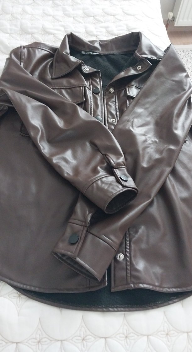 Az giyildi hiç kusuru yok evde çok ceket var yer açılsın diye satıyorum Düğmeli cepleri ve kesik yaka detaylarıyla kahverengi deri, midi boy, uzun kollu, dar kesim kadın ceket.