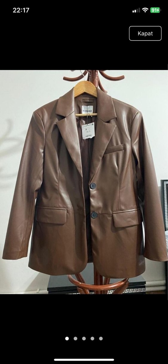 Kahverengi deri, düğmeli, notched yakalı kadın ceket. Normal kesim, uzun kollu ve parlak görünümlü, ofis veya günlük kullanıma uygun.