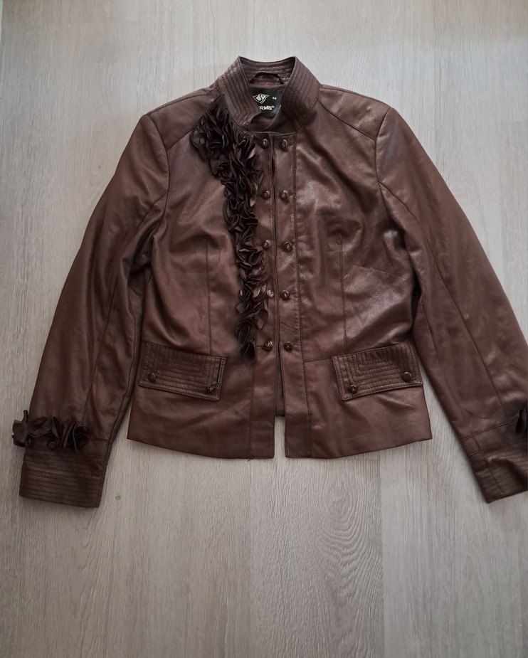 Kahverengi deri kadın ceket, düğmeli ve notched lapel yakaya sahiptir. Strappy kollu, normal boyda ve regular fit kesimdedir. Ofis kullanımı için uygundur, Paris tarzı ve floral detaylıdır. 44 yaziyor ama 3840 için daha uygun 40 işaretledim