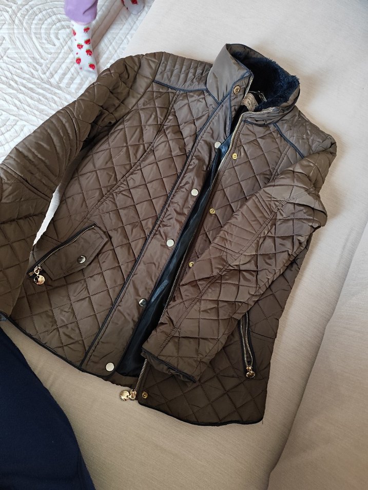 Düğmeli kahverengi ceket, kesikli yaka ve strappy kollara sahiptir. Orta boy, düzenli kesim ve kapitone detaylarla günlük kullanıma uygundur.