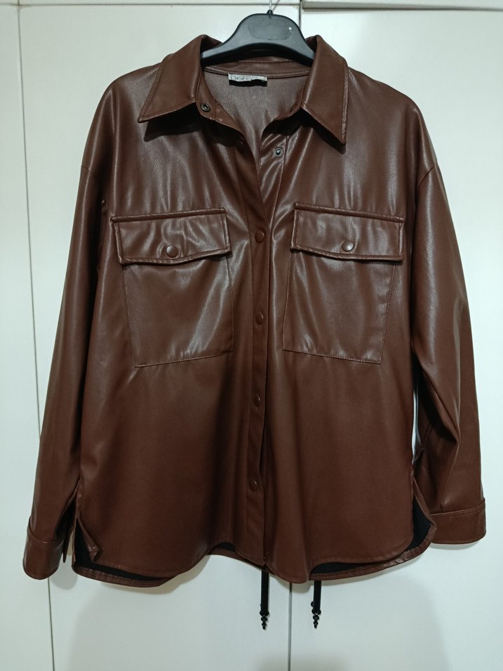 Düğmeli Kahverengi Deri Kadın Ceket