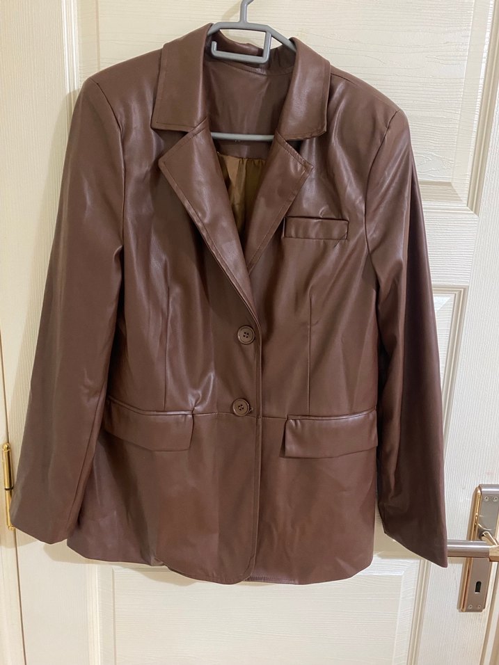 Düğmeli Kahverengi Deri Kadın Ceket