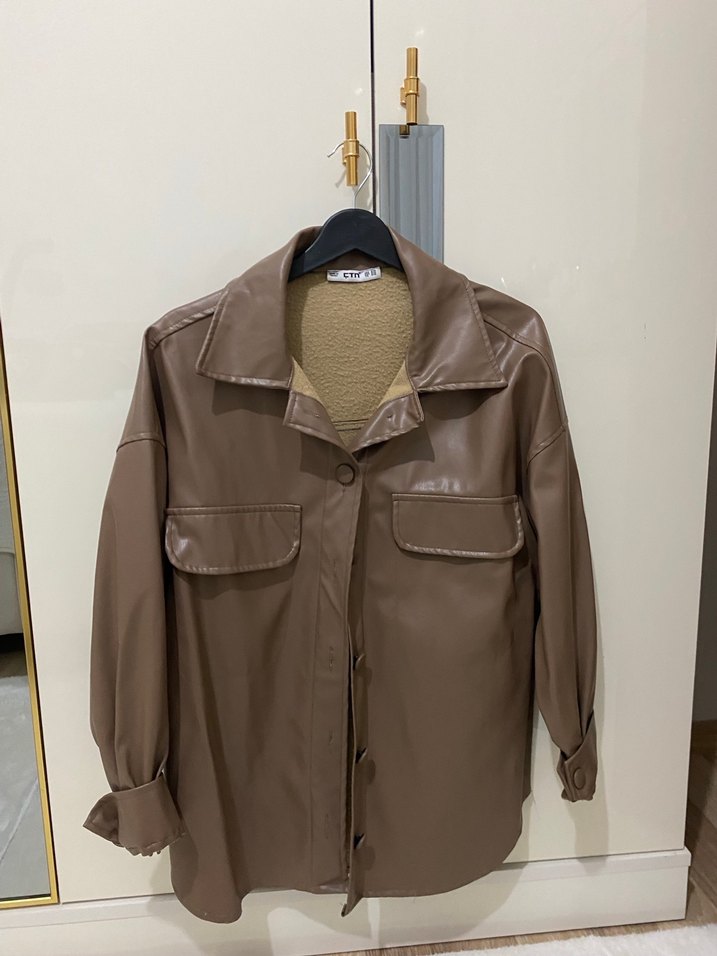 Parlak kahverengi deri ceket, düğmeli, uzun kollu ve notlu yaka detayına sahiptir. Salaş kesimiyle günlük sokak stiline uygundur.