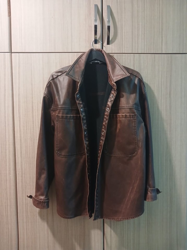 Kahverengi deri ceket, düğmeli, uzun kollu ve normal kesimdir. Notch yaka ve midi boyuyla gündelik rahat sokak stiline uygundur.