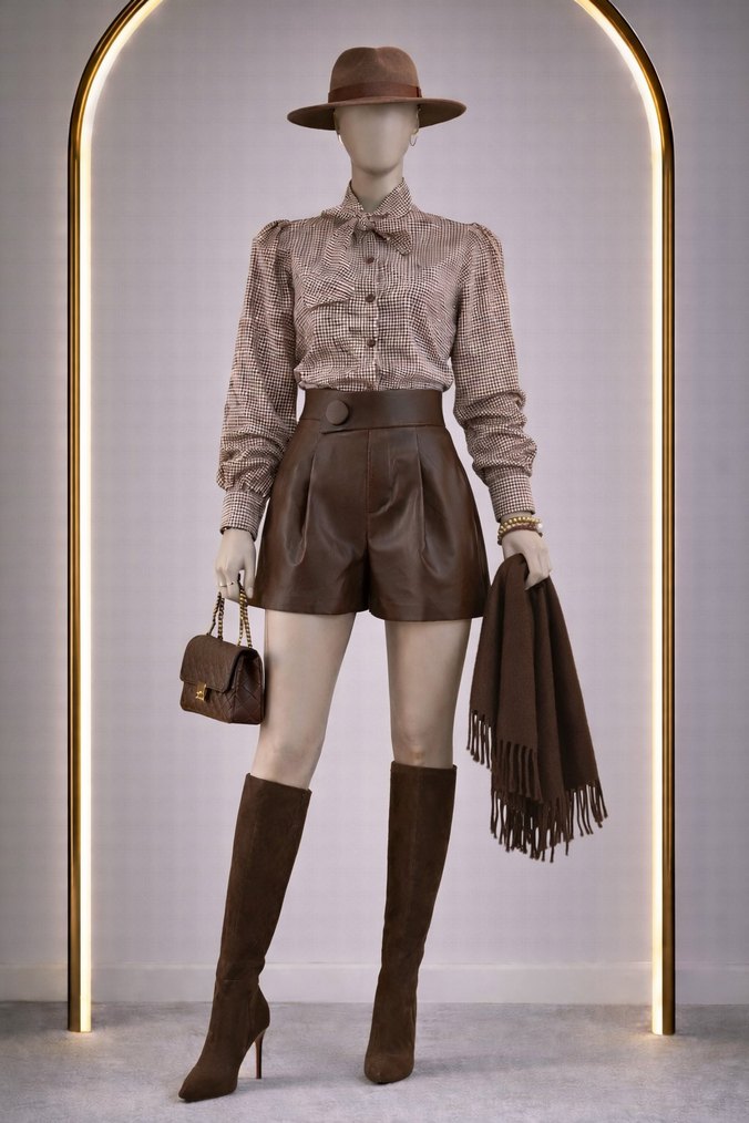 Düğmeli bel ve bol kesimiyle kahverengi mini deri şort, günlük rahat kullanıma uygundur.