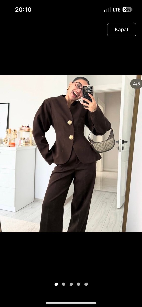 Düğmeli kahverengi deri kadın takım elbise, kesimli yaka ve uzun kolludur. Ofis için uygun, midi boy ve rahat kalıptadır. Şık ve sade tasarıma sahiptir.