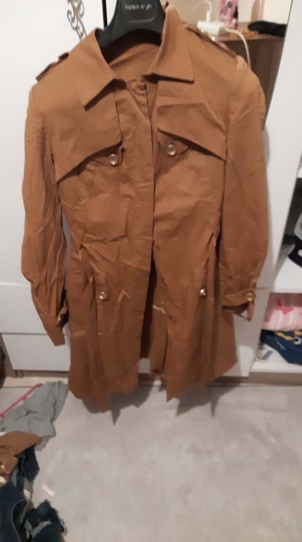 Uzun kahverengi deri trençkot, parlak yüzey, düğmeli ön ve kesik yaka ile tasarlanmıştır. Bol kesim ve uzun kolludur, Paris sokak modasına uygundur. boy 100 santim Armağan marka