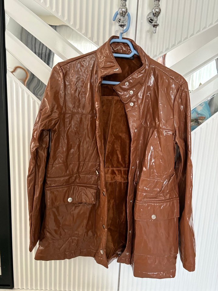 Kahverengi parlak deri kadın yağmurluk, düğmeli ve kesimli yaka detaylarına sahiptir. Midi boy ve regular fit olan bu parça günlük kullanıma uygundur. ️