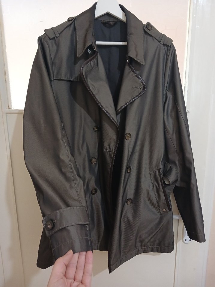 Kahverengi deri midi trençkot, düğmeli ve kesimli yakaya sahip. Uzun kollu ve normal kesim, ofis için uygun. İtalyan kesim