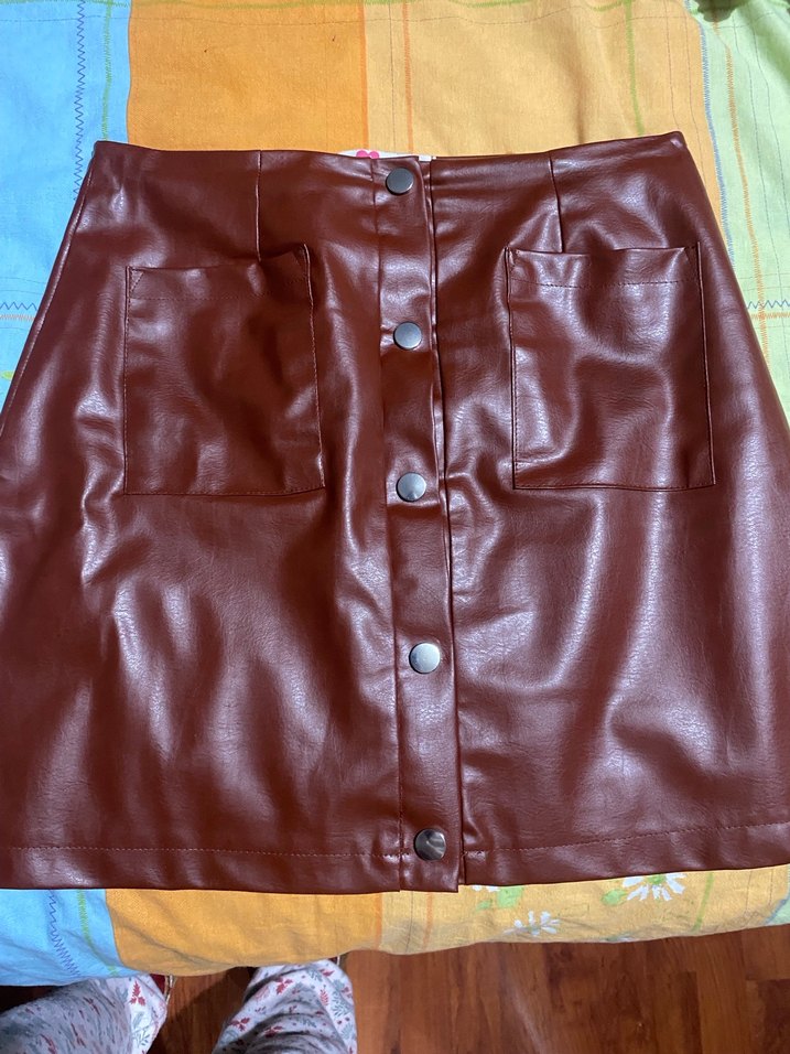 Düğmeli ön kısmı ve iki cep detayı olan kahverengi, fitted deri mini etek, vintage bohem tarzını yansıtır.