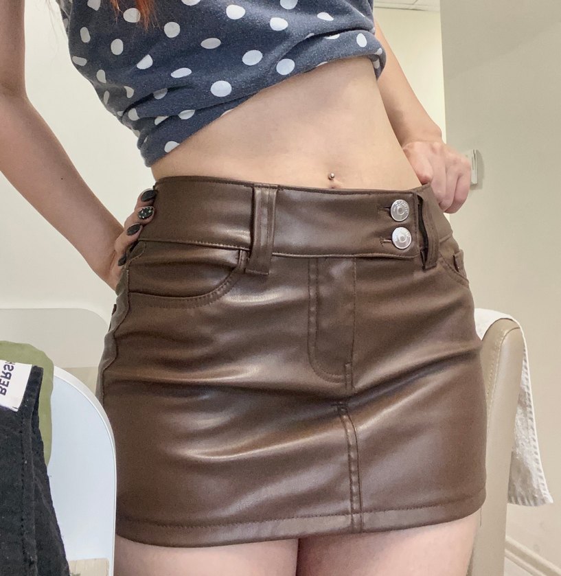 Düğmeli kahverengi deri mini etek, fitted kesim ve desensiz. 32 beden dar kalıp yepyeni duruyor hiç giyilmedi