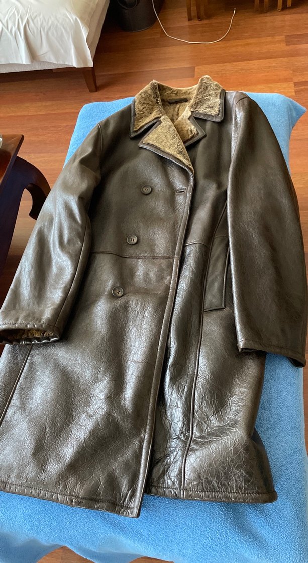 Kahverengi uzun deri erkek kaban, düğmeli, kesik yakalı ve uzun kolludur. Rahat kesim ve yumuşak iç astar bulunur.